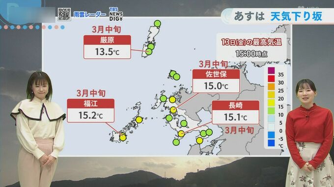 きょう13日(金)は日差したっぷりの影響で気温がぐんぐん上昇しました。長崎や佐世保、福江では15度を超え、3月中旬並みの暖かさとなりました。
