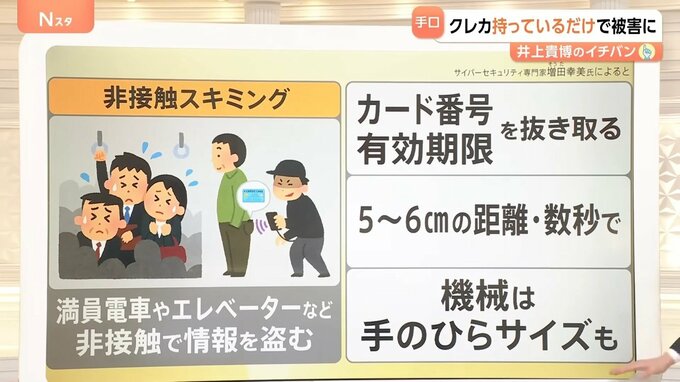 また、満員電車やエレベーターなど、非接触でカード番号や有効期限などの情報を抜き取る「非接触のスキミング」という手口があります。
