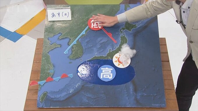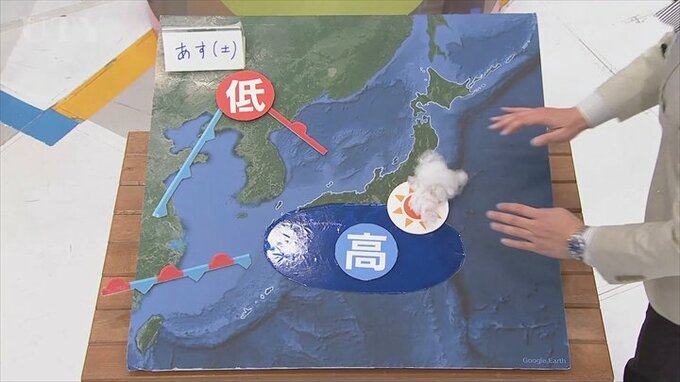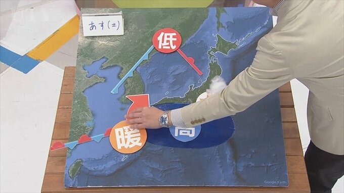 きょうと大きく違うのは、西の方から低気圧や前線が東へ進んできます。