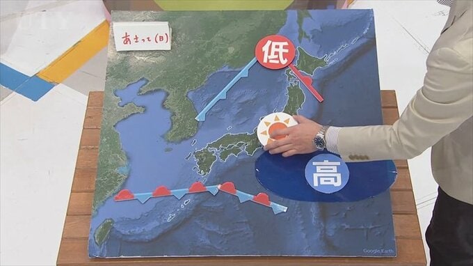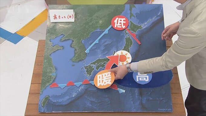 あさって日曜日の天気はどうなるかというと、高気圧が東に離れていきます。