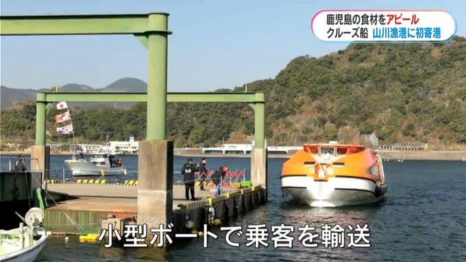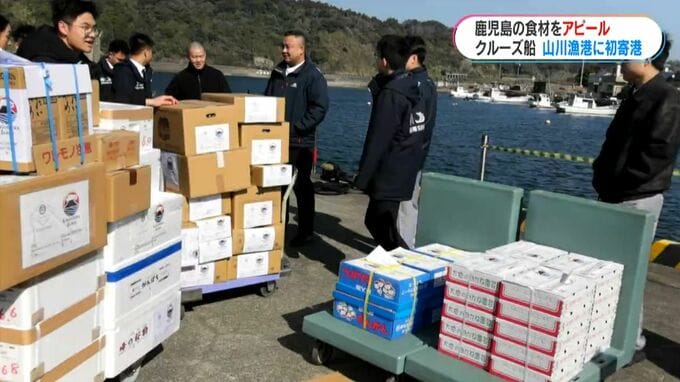 指宿市の山川漁港に13日、初めてクルーズ船が寄港しました。船内で鹿児島の食を楽しんでもらおうと、県産の食材がクルーズ船に積み込まれました。