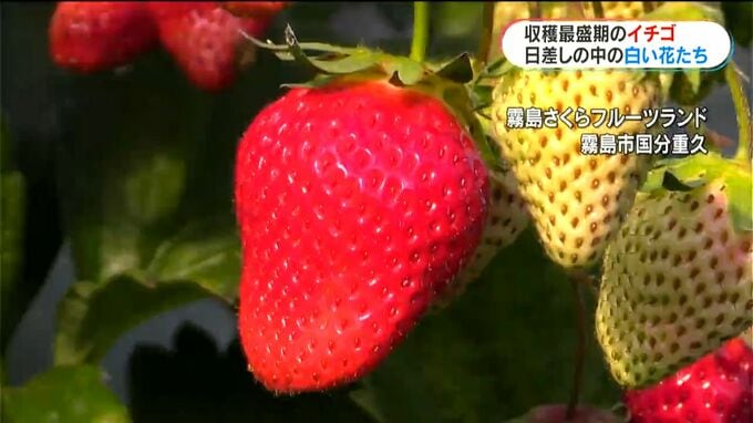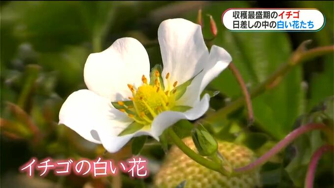 こちらは霧島市にあるイチゴ農園。この時期は甘みが強くなり収穫の最盛期だそうです。ハウスの中にはおよそ4万株の苗があり、あちこちで、かわいらしいイチゴの白い花が咲いていました。