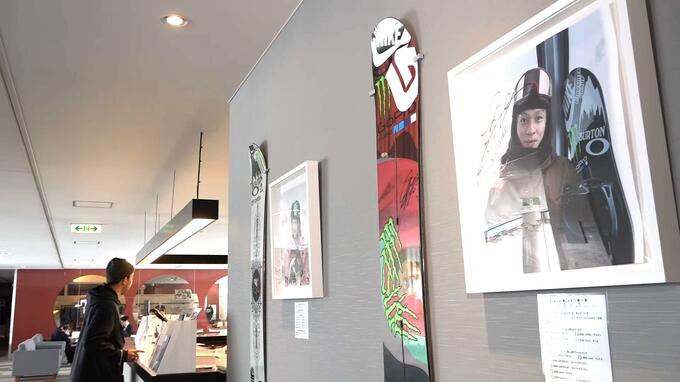スキー場は、ハーフパイプの強化拠点となっていて、平野歩夢 選手をはじめ日本代表が練習を重ねてきた場所です。施設には、平野選手の愛用していたボードが飾られるなど応援一色です。