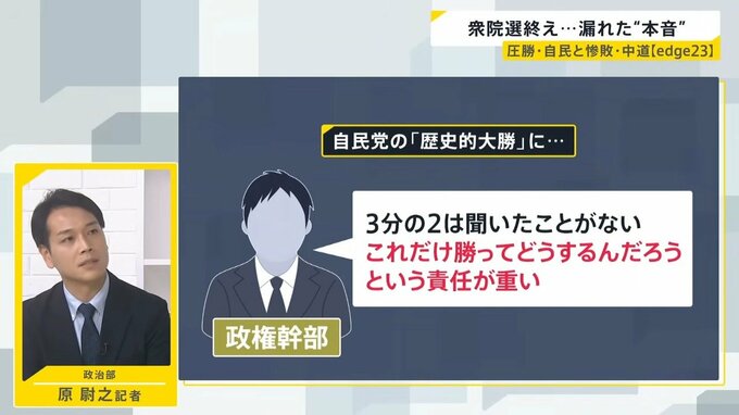 自民党は小選挙区と比例代表を合わせて316議席を獲得し、単独で3分の2を超える「歴史的大勝」を収めた。これは憲法改正の発議が単独でも可能となる数字だ。そんな勝利の陰で、原記者によると政権幹部からはある“予想外の声”が聞こえてきたという。
