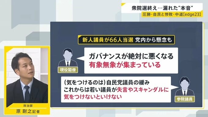 驚きを隠せない様子の政権幹部の言葉からは、圧勝による重圧感が伝わってくる。また、今回の選挙では自民党から66人もの新人議員が当選。この状況に対して「党内からは懸念の声も上がっている」と原記者は指摘する。