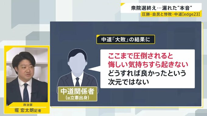 選挙当日の中道の開票センターで取材をしていた堀記者は、開票開始から50分後の午後8時50分には「今日は花付けをやりません」とのアナウンスが流れ、早くも大敗を悟っていた様子が見て取れたと当時を振り返る。