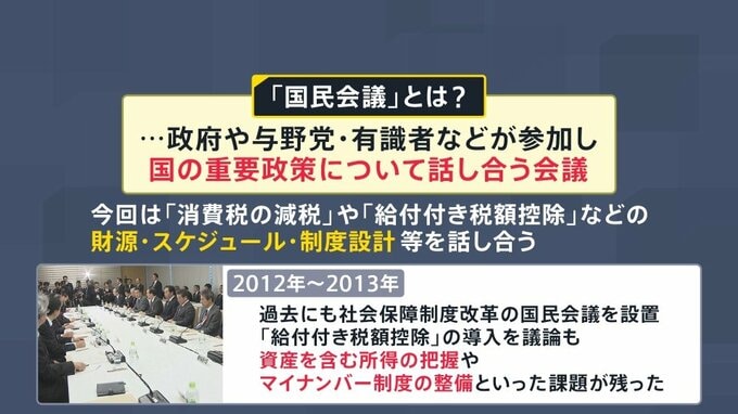 国民会議とは、政府や与野党・有識者などが参加し、国の重要政策について話し合う会議だ。今回は「消費税の減税」や「給付付き税額控除」などの財源・スケジュール・制度設計等を話し合う場となる。過去にも2012年から2013年にかけて社会保障制度改革の国民会議が設置され、「給付付き税額控除」の導入が議論されたが、資産を含む所得の把握やマイナンバー制度の整備といった課題が残った経緯がある。