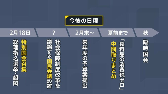 選挙結果を受け、高市早苗総理は公約に掲げた「2年間に限り食料品の消費税をゼロ」にすることについて、国民会議を早期に設置し、「夏前には中間取りまとめを行いたい」と意欲を示した。