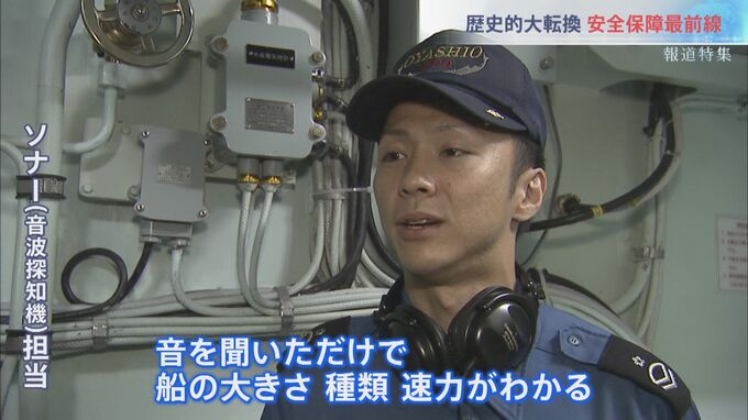 ソナー(音波探知機)担当者「音を聞いただけで、船の大きさ、種類、速力がわかる。(探知できる)距離は性能上の秘密だが、かなりとれる」