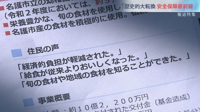 交付金を受けた沖縄県名護市を『学校給食費の無償化と共に質の向上に活用』と紹介している。