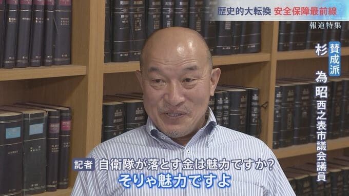 「(自衛隊が落とす金は魅力ですか?)そりゃ魅力ですよ。どこの自治体もそうじゃないですか。国防のために落とされた“棚からぼたもち”。(仮に基地の話がなかったらどうですか?)厳しいですよね。人口流出に歯止めがかからないと思います」
