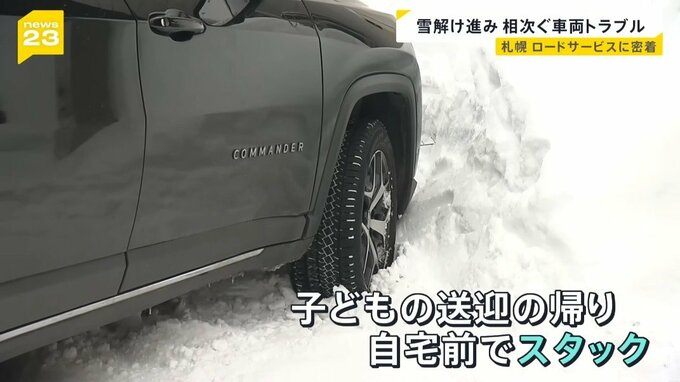 雪によるタイヤの“スタック”です。こちらの車は、子どもを保育園へ送迎した帰りに自宅の目の前でスタックしたといいます。前輪が雪に埋まった車。依頼者は、救出作業を見守ることしかできません。