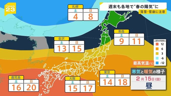 この暖かさは週末も続く予想で、暖かい空気が北上し、東京では18℃、鹿児島では20℃と、4月上旬並みの気温になりそうです。積雪の多い地域では落雪やなだれに、より一層の注意が必要です。