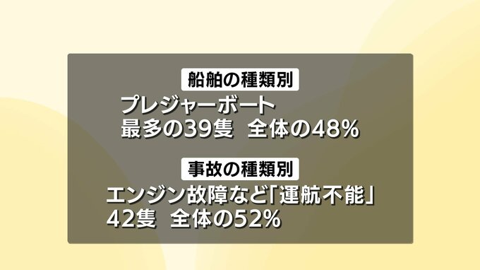 また、事故の種類では、エンジンの故障などによる「運航不能」が42隻となっていて半数を超えました。
