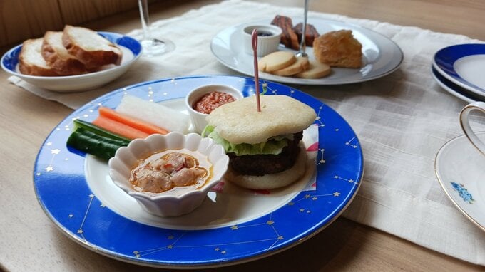 「山の恵み軽食」は東京の人気イタリア料理店のシェフ監修によるメニューで、メインのシカ肉ハンバーガーは大槌町産のシカ肉を特製ソースで煮込んだパティを米粉のバンズではさみました。