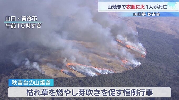 山口県美祢市の秋吉台で恒例の山焼きが行われ、衣服に火が燃え移り、作業していた1人が死亡しました。山焼きは枯れ草を燃やして、新たな芽吹きを促す秋吉台の春の恒例行事です。美祢市などによりますと、午前10時2…