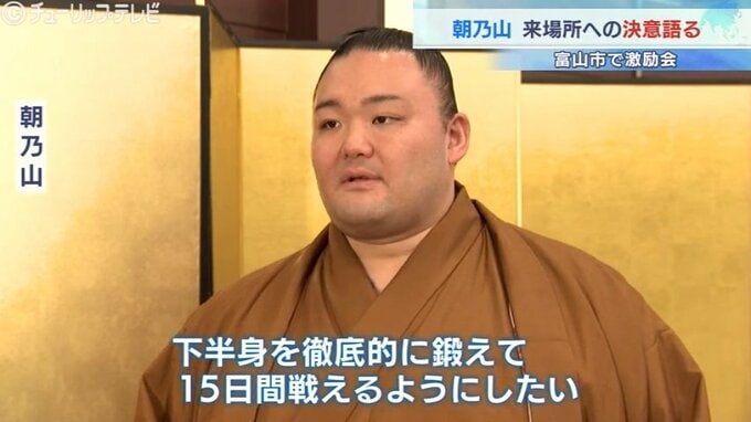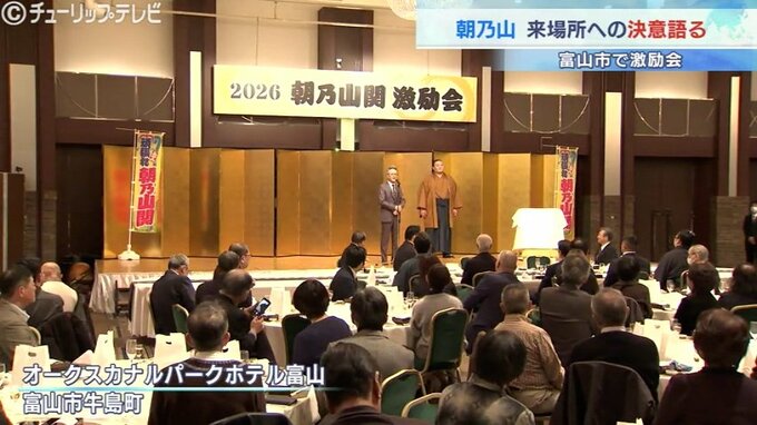 富山市出身の朝乃山が、市内で開かれた激励会で来場所は2桁勝利を目指したいと決意を語りました。