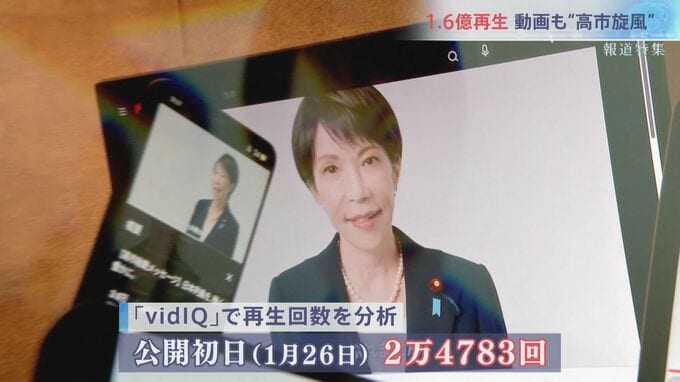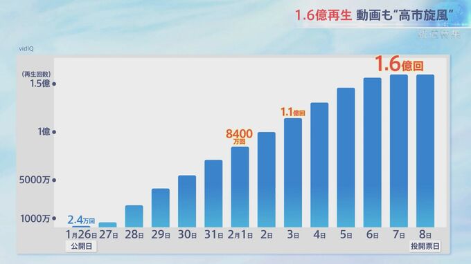 遊説中に手を痛めたとして、NHKの討論番組を欠席したが、午後には岐阜県で応援演説した2月1日には、再生回数は8000万回を超えた。