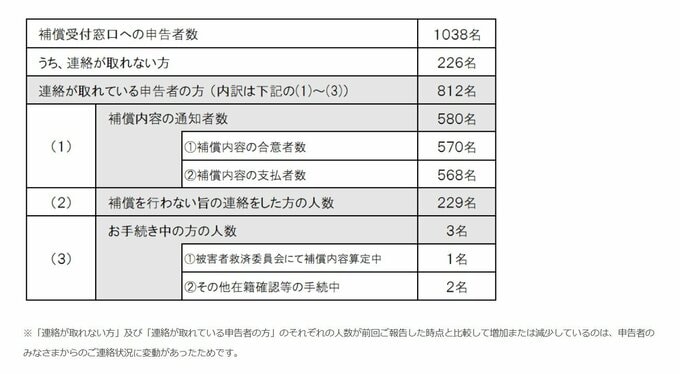 更に「本日時点では、3名(約1%)の方について、在籍実績の確認や被害者救済委員会によるヒアリングなどの手続中です。そのうち、被害者救済委員会において補償内容を算定するための手続中の方は1名であり、その他在籍実績の確認等の手続中の方は2名です。」と、しました。