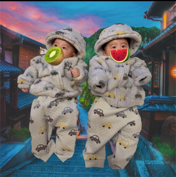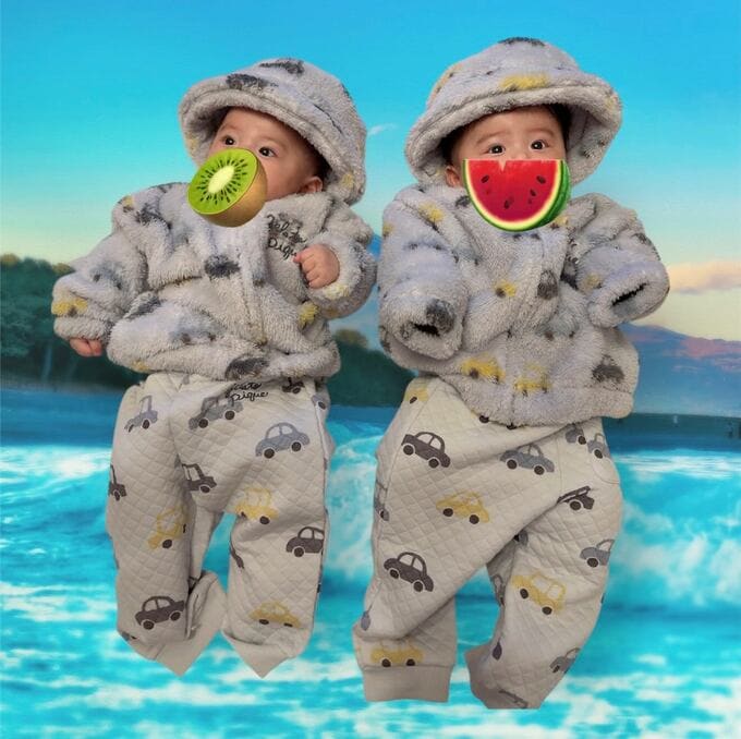 投稿された写真では、双子の赤ちゃんが車の柄が散りばめられた灰色の洋服を着ている様子も見られます。