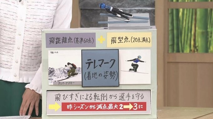 採点は、「飛距離点(基準点60点)」と、姿勢の美しさ「飛型点(20点満点)」で争われ、「飛型点」では着地ポーズの「テレマーク」も採点対象です。