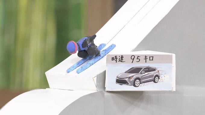 助走すると、速度はラージでは時速95キロほどに達し、高速道路を走る自動車並みのスピードで飛び立ちます。踏み切り台からの高低差は、ビルの20階に相当する88メートル以上もあります。