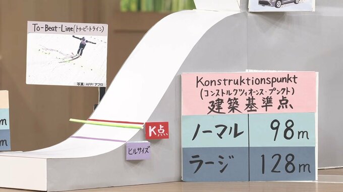 飛距離で採点の基準点となるのは、「K点」=ドイツ語のKonstruktionspunkt(コンストルクツィオーンス・プンクト)、建築基準点です。
