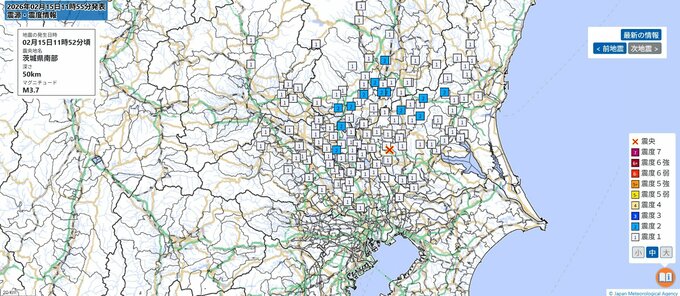 15日午前11時52分ごろ、関東地方で地震がありました。 気象庁によりますと、震源地は茨城県南部で、震源の深さは約50km、地震の規模を示すマグニチュードは3.7と推定されます。この地震による津波の心配はありません。