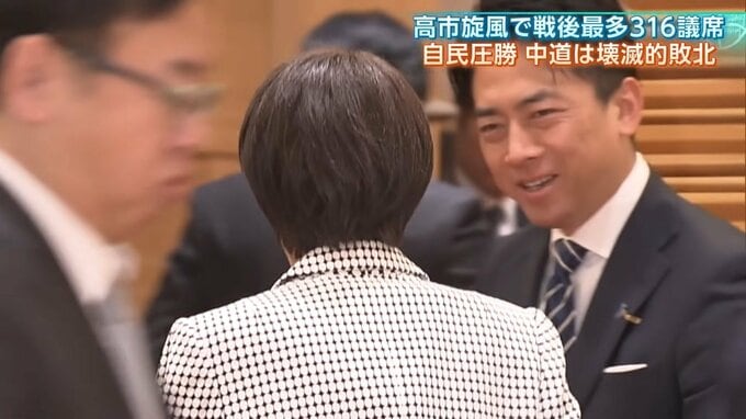 2月10日、衆院選後の最初の閣議で、笑顔で話しかける小泉防衛大臣の腕を軽く叩き、部屋を出る高市総理。他の閣僚たちも明るい雰囲気です。