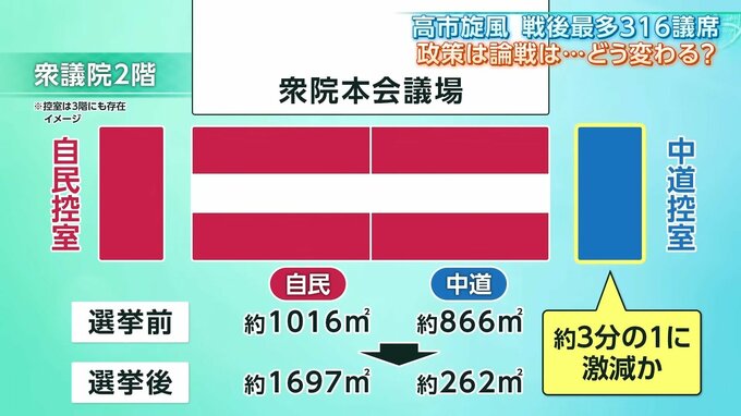 国会にある各会派の控室は、議員1人当たり約5平方メートルが割り当てられていて、所属議員数によって広さが決まります。解散時には自⺠党約1000㎡、中道約860㎡だった控室ですが、この国会からは中道は260㎡となり、控室が約3分の1に激減する見込みに。