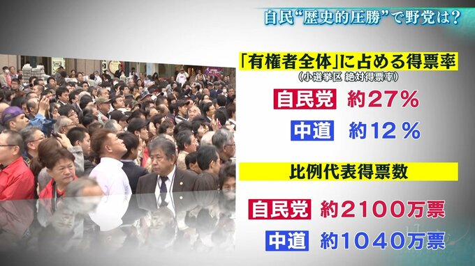 今回、自民党は小選挙区の議席数の86%を占めた一方、中道はわずか2%。これだけ見れば圧倒的な差です。ところが「有権者全体」に占める得票率は自民党27%に対し、中道12%で、比例代表の得票は自民党の約2100万票に対し、中道は約1040万票です。