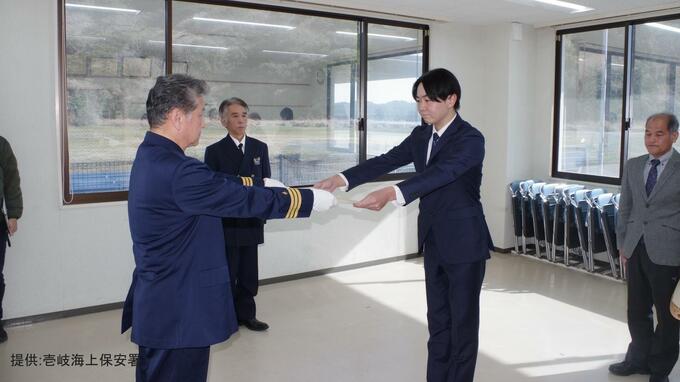 2月12日、壱岐海上保安署は海難事故に遭った船の乗組員3人を救助した2人に感謝状を贈呈しました。