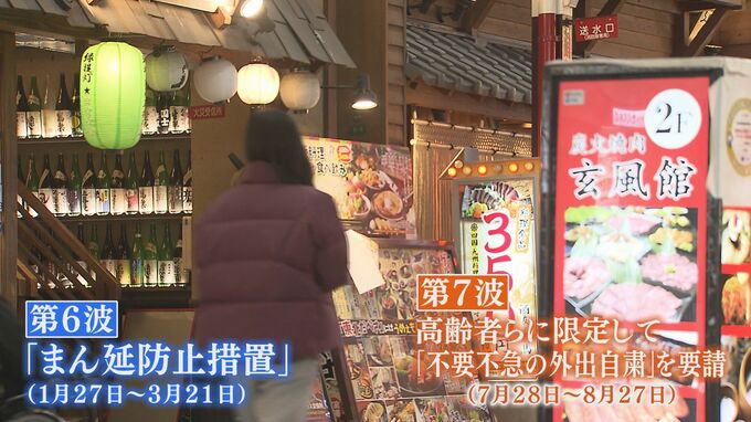 大阪府は第6波では、今年1月27日~3月21日にまん延防止等重点措置として、飲食店に時短営業と酒類の提供自粛を要請。ただ、第7波の今年7月28日~8月27日には、高齢者らに限定して「不要不急の外出自粛」を要請します。