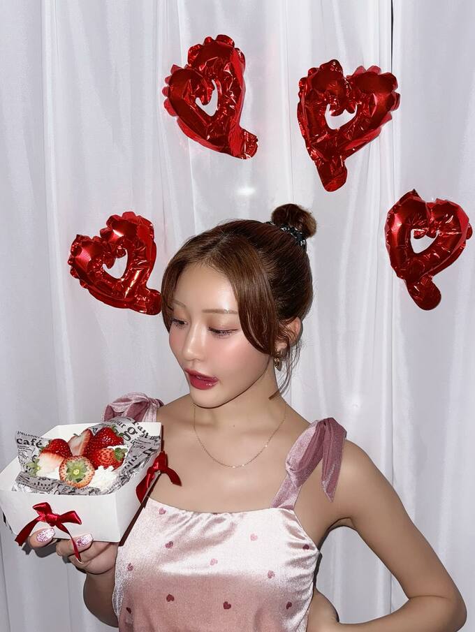 王林さんは「VALENTINE 今年は友達と集まってスイーツ作りしたのよん」とハート形のバルーンが飾られたカーテン前で、ポーズをとりながら続けて「VALENTINEに着たかったroom wear メンコイ」と綴っていました。