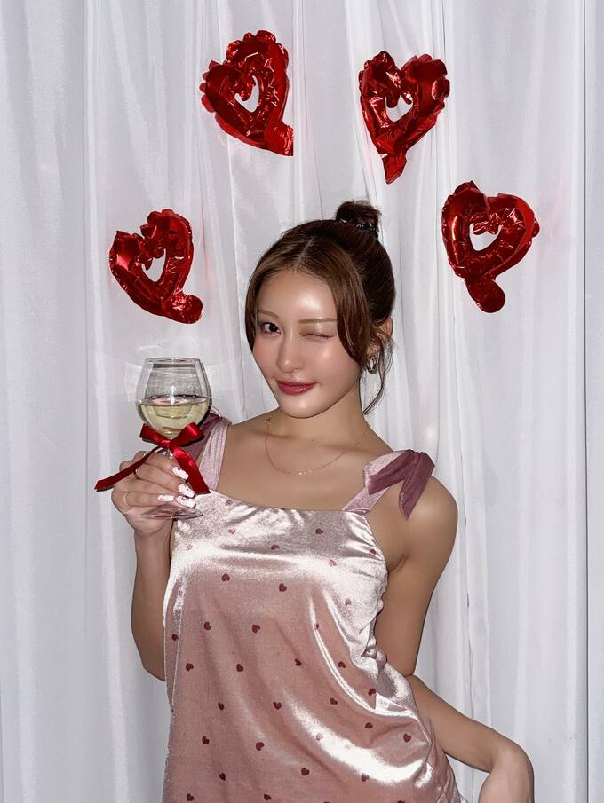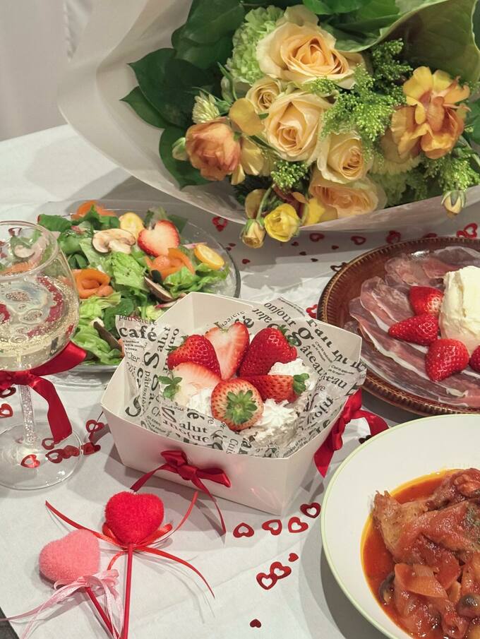 赤いリボンをあしらったシャンパングラスの手元は、ルームウェアと同系色のグリッターローズでネイルを飾り、別のカットでは友達と作ったスイーツ片手に、舌を出しながら、視線をケーキに送るカットも掲載しました。