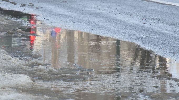 正午すぎの気温が5.8℃と3月下旬並みの暖かさとなった札幌市では、先月の大雪で積もった雪が解けて、道路には、大きな水たまりができていました。