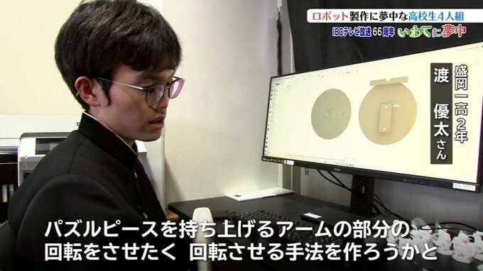 AIやプログラミングを駆使する盛岡一高の四銃士 抜群のチームワークを武器に「メイドイン岩手」のロボット製作へ夢中な高校生たち IBC岩手放送 2026年2月17日(火) 06:00 国内 3Dプリンターも駆使して図形と向き合う 図形と向き合うのは渡さん。 渡優太さん 「パズルピースを持ち上げるアームの部分の回転をさせたく、回転させる手法を作ろうかなと」 3Dプリンターも駆使してロボットに必要な部品を作ります。