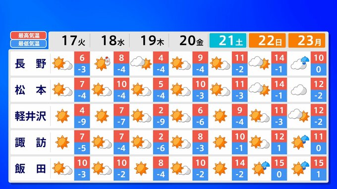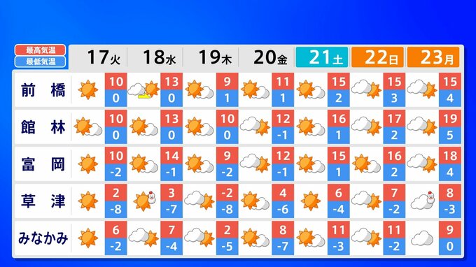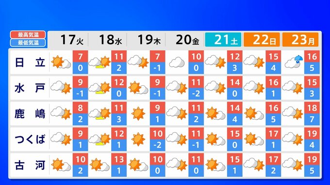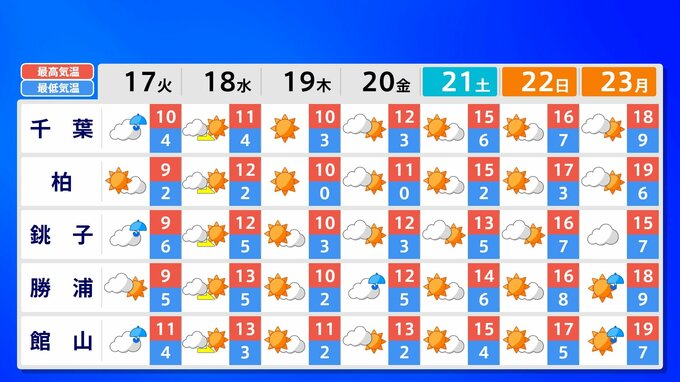 関東甲信地方 各都市の週間予報(3連休の天気)