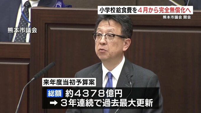熊本市議会が16日に開会し、市内の小学校の給食費を4月から完全無償化する方針が示されました。
