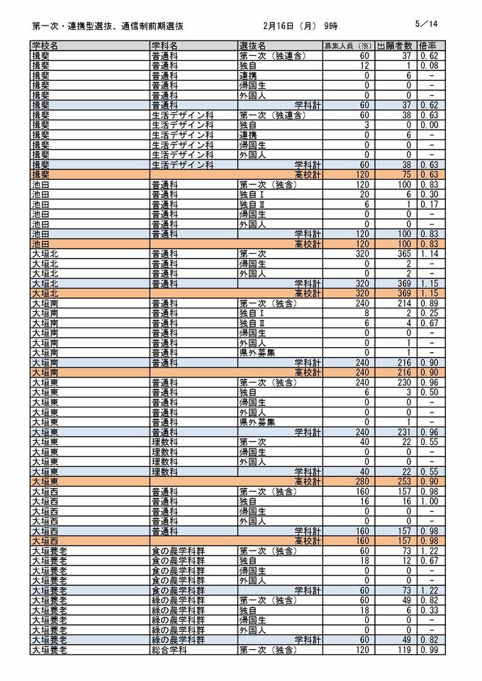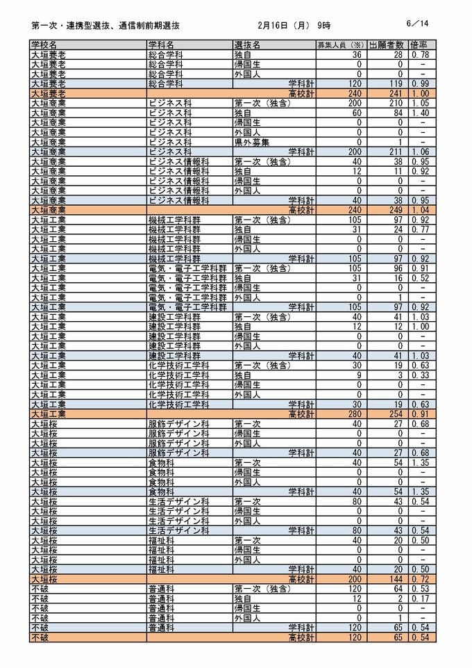 【岐阜県公立高校入試2026】出願状況(16日午前9時時点)第一次・連携型選抜・通信制前期選抜の志願倍率 岐阜・普通1.14倍 大垣北・普通1.14倍 岐阜北・普通1.19倍 加納・普通1.31倍 全校掲載・一覧(令和8年度) CBCテレビ 2026年2月16日(月) 12:08 国内 岐阜・西濃エリア(大垣北・大垣東・大垣南など)の各校出願状況・倍率 岐阜県教育委員会の発表 岐阜県教育委員会の発表
