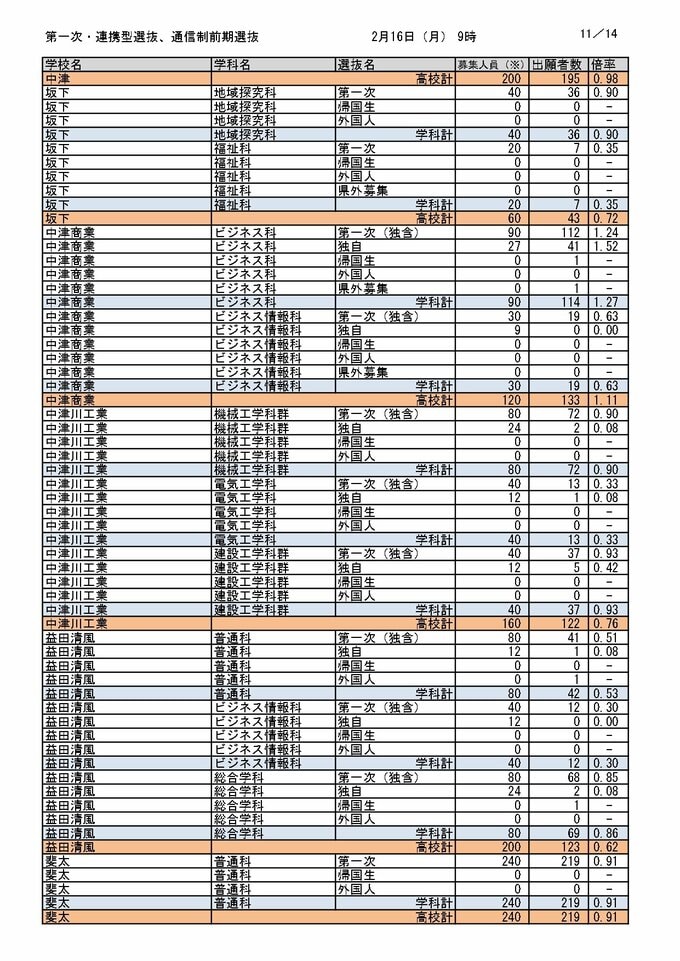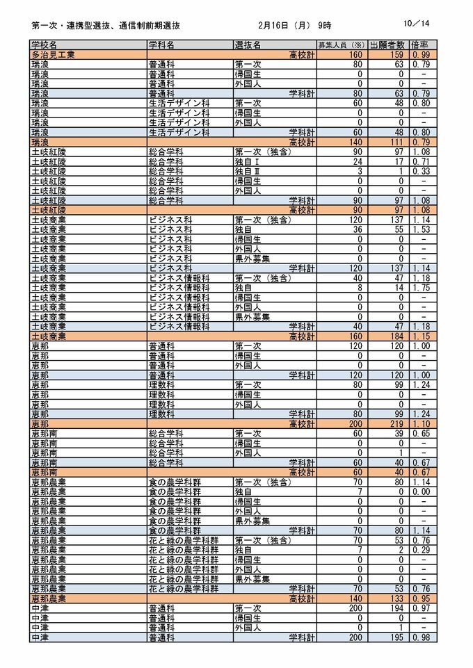 【岐阜県公立高校入試2026】出願状況(16日午前9時時点)第一次・連携型選抜・通信制前期選抜の志願倍率 岐阜・普通1.14倍 大垣北・普通1.14倍 岐阜北・普通1.19倍 加納・普通1.31倍 全校掲載・一覧(令和8年度) CBCテレビ 2026年2月16日(月) 12:08 国内 東濃・飛騨エリア(多治見・恵那など)の各校出願状況・倍率 岐阜県教育委員会の発表 岐阜県教育委員会の発表 岐阜県教育委員会の発表