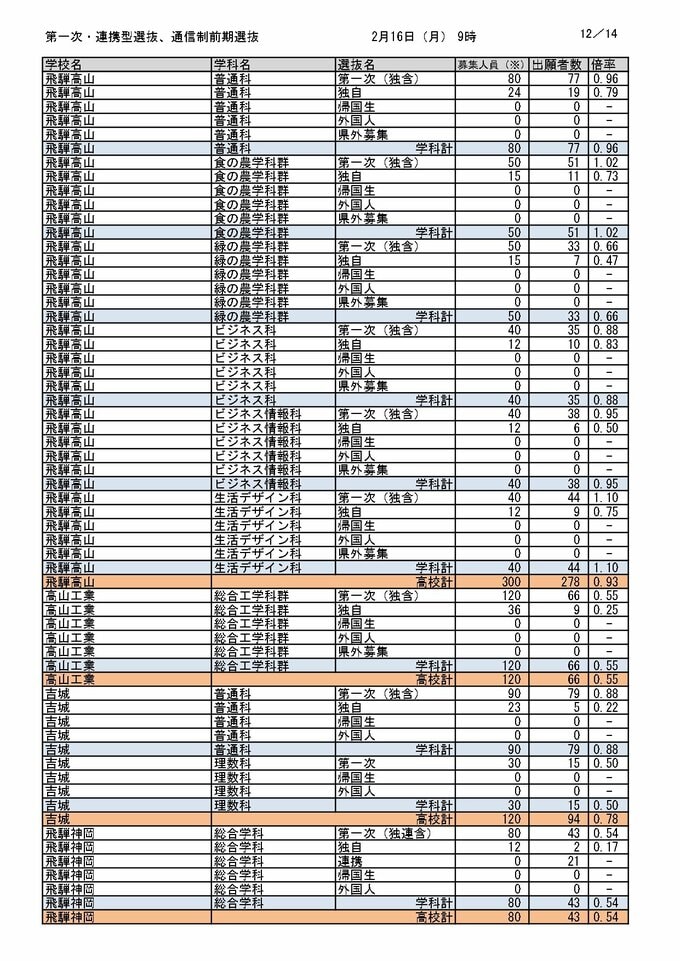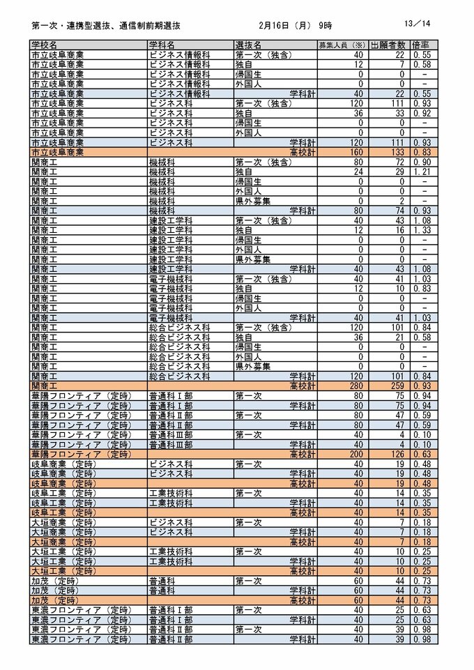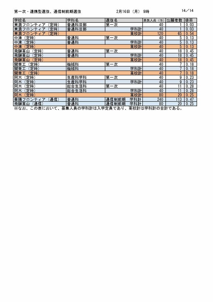 【岐阜県公立高校入試2026】出願状況(16日午前9時時点)第一次・連携型選抜・通信制前期選抜の志願倍率 岐阜・普通1.14倍 大垣北・普通1.14倍 岐阜北・普通1.19倍 加納・普通1.31倍 全校掲載・一覧(令和8年度) CBCテレビ 2026年2月16日(月) 12:08 国内 飛騨エリア(斐太・飛騨高山・益田清風など)定時制・通信制前期選抜の各校出願状況・倍率 岐阜県教育委員会の発表 岐阜県教育委員会の発表 岐阜県教育委員会の発表