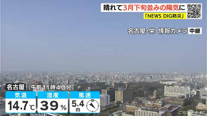 正午前の名古屋市内は、朝から青空が広がっています。この時間の気温は14.7℃で、風が強く吹いています。