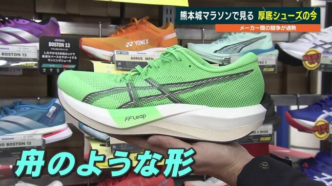 厚底シューズは、ソールにカーボンなどを用いたプレートが入るシューズで、舟のような形が特徴的です。