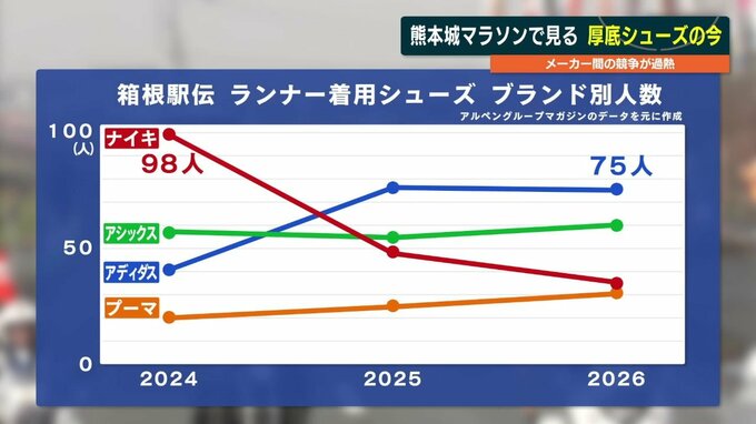 スポーツ用品の量販店がまとめた、箱根駅伝出場選手のシューズをメーカーごとに比べると、2024年はナイキが98人と圧倒的な人気を誇っていましたが、去年、アディダスが逆転しました。