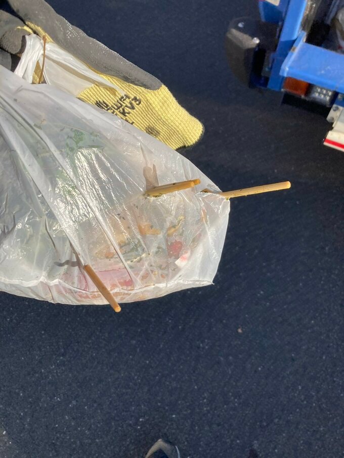 滝沢秀一さんは、「竹串や割り箸はごみ袋を突き破るので、ごま油等の汚れの落ちにくい容器に入れて、可燃ごみに出すことをオススメします!」と投稿。