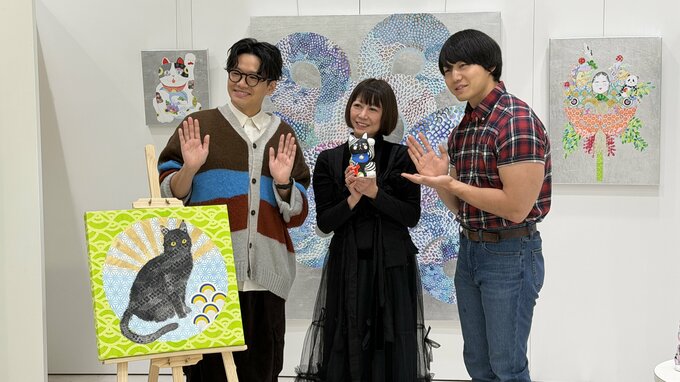 現代アーティストのKAORUKOさん、ミキの亜生さん、かけおちの青木マッチョさんが、「KAORUKO exhibition『福をまねくものたち』」囲み取材に登壇しました。