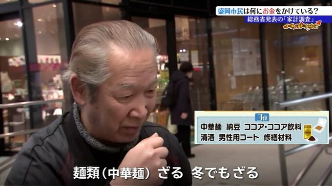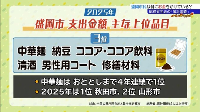 盛岡市民はゼリーがお好き? 全国家計調査“10年で7回も支出額1位”の謎 「常備派」vs「ピンとこない派」買い物事情に迫る IBC岩手放送 2026年2月16日(月) 19:03 国内 3位の品目は? 3位グループはこちらです。 このうち中華麺は、2024年まで4年連続で1位でしたが、今回は1位秋田市、2位山形市に次ぐ3位でした。 「中華麺も買いますね。冷たくして食べたりして。ざる中華です」 「麺類。ざるですね。冬でもざるです」
