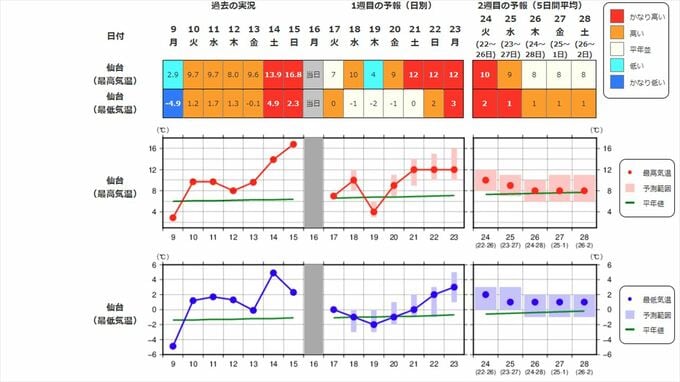 東北地方の向こう2週間の気温は、寒気の影響を受けにくく暖かい空気が流れ込みやすい時期があるため平年並か高い日が多く、22日頃からはかなり高くなる見込みです。