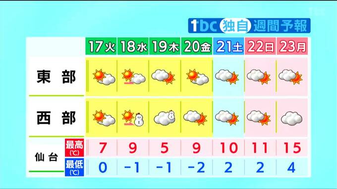 向こう一週間、東部を中心に晴れるでしょう。西部も晴れ間の出る日が多いですが、水曜と木曜は、前線や寒気の影響で雪が降る見込みです。最高気温は、平年より高い日が多いものの、木曜日は、上空の強い寒気の影響で厳しい寒さに戻るでしょう。